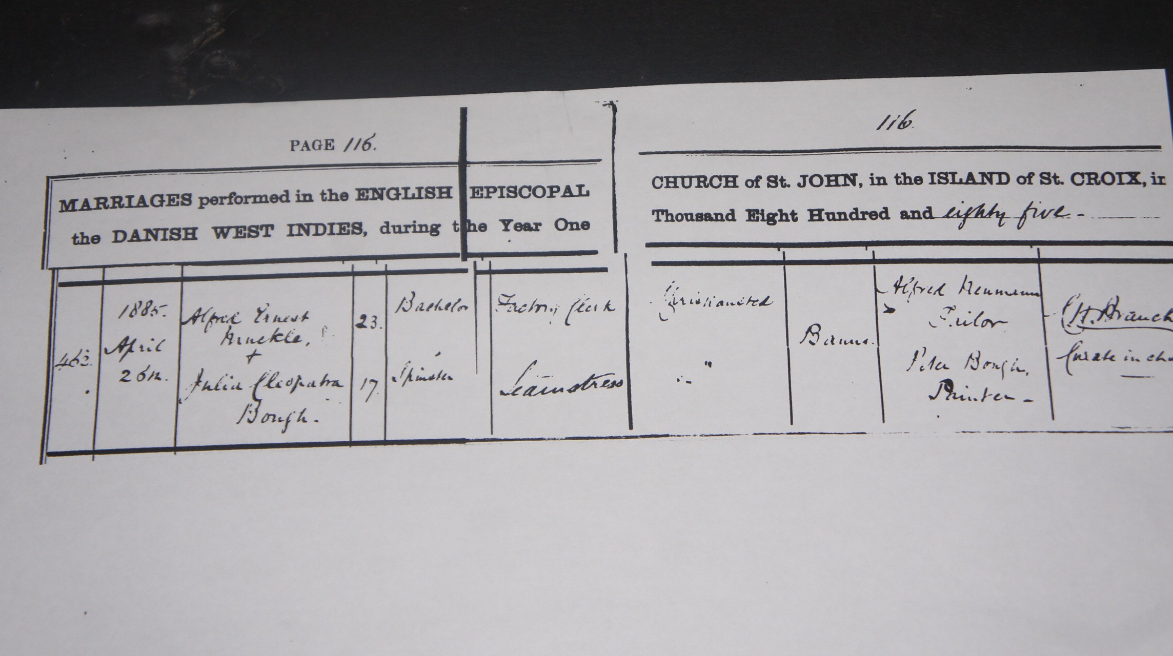 My 3x great-aunt Julia C. Bough was a 17-year-old seamstress, her husband Alfred Ernest Muckle was a 23-year-old Factory Clerk, both from Christiansted St. Croix.