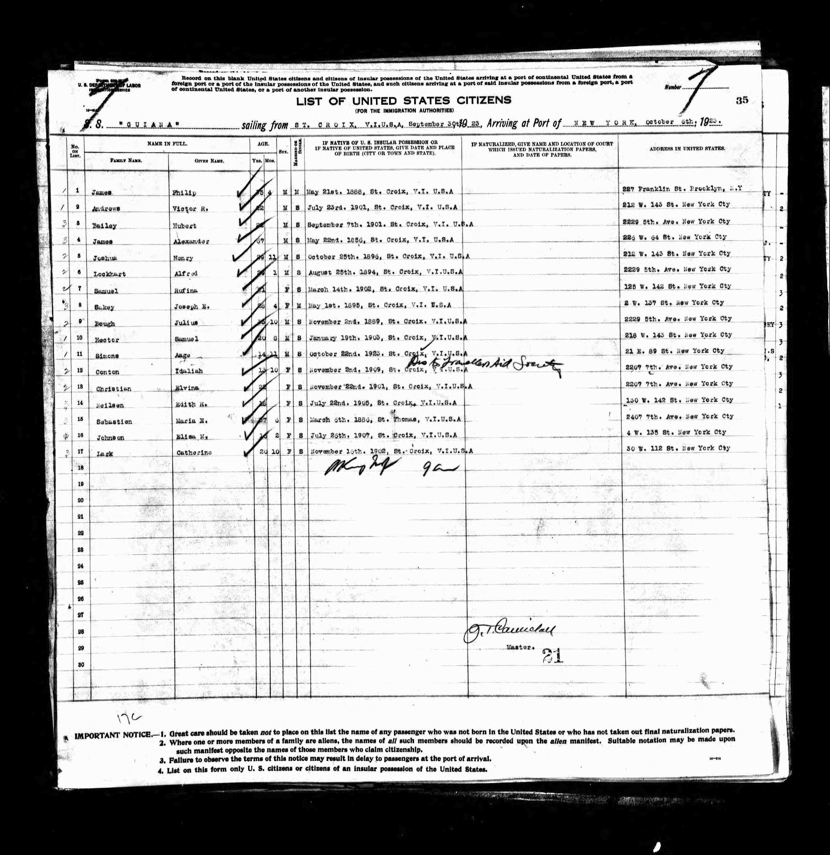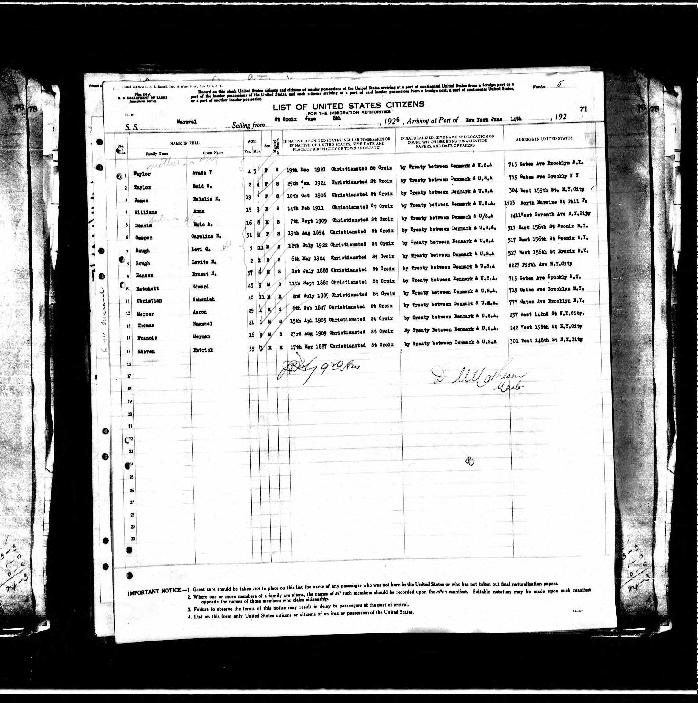 My grandparents are among the first US Virgin Islanders to migrate and settle in New York. My grandfather went up first and later sent for his wife and children as shown in the New York Passengers List, 1820-1957.