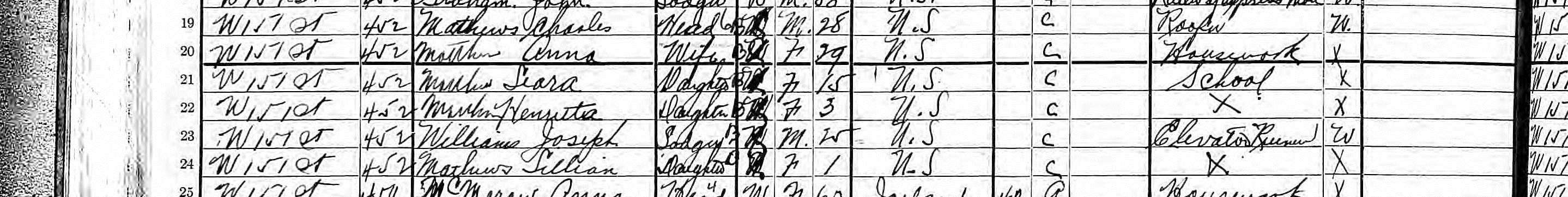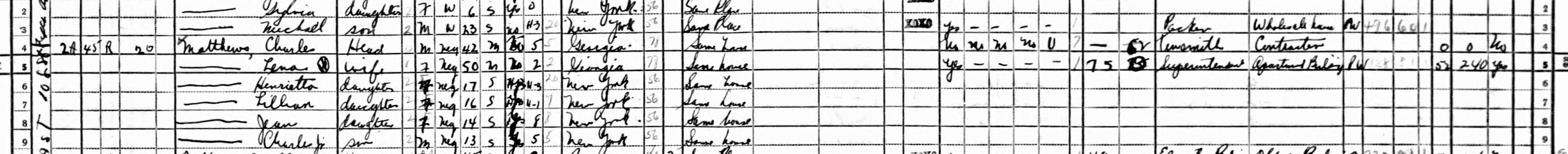 In 1940, Charlie Mathews was living with his second wife Lena, along with his four children Henrietta, Jean, Lillian and Charles at East 108th Street in Manhattan, New York. He was employed as a tinsmith.