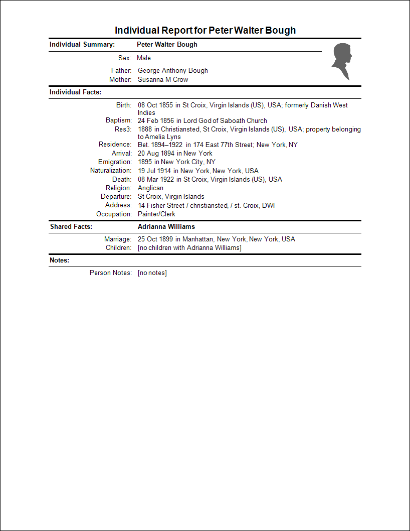 Peter is the brother of my 3rd Great-Grandfather and the youngest son for his mother Susan Crow-Bough. As an apprentice at 15 he studied a trade which carried him throughout most of his life. He was the hint, that supported the oral history connection of the Muckle branch to the family tree. Peter Bough was listed as a witness on the marriage record of his niece, Julia Bough and Alfred Muckle in the Anglican Church. I was amazed at his travels, which included a trip to Boston visiting his nephew Dr. Irvin Bough as well as his livelihood as a painter. At first, I thought he was an artist, but further research showed that he was not an artist but was an accomplished self-employed painter who worked for private families. He must have been very successful to be able to live on the Upper East Side of New York in the early part of the 1900’s. As someone who was born in New York, I can tell you that you would not have found many persons of color from the Danish West Indies living in that area; most of us lived in Harlem. I was very impressed to know that my Uncle Peter was a man of prestige and prominence. Peter was married to Adrianna Williams of St. Croix. He died in New York he was 67 years old.