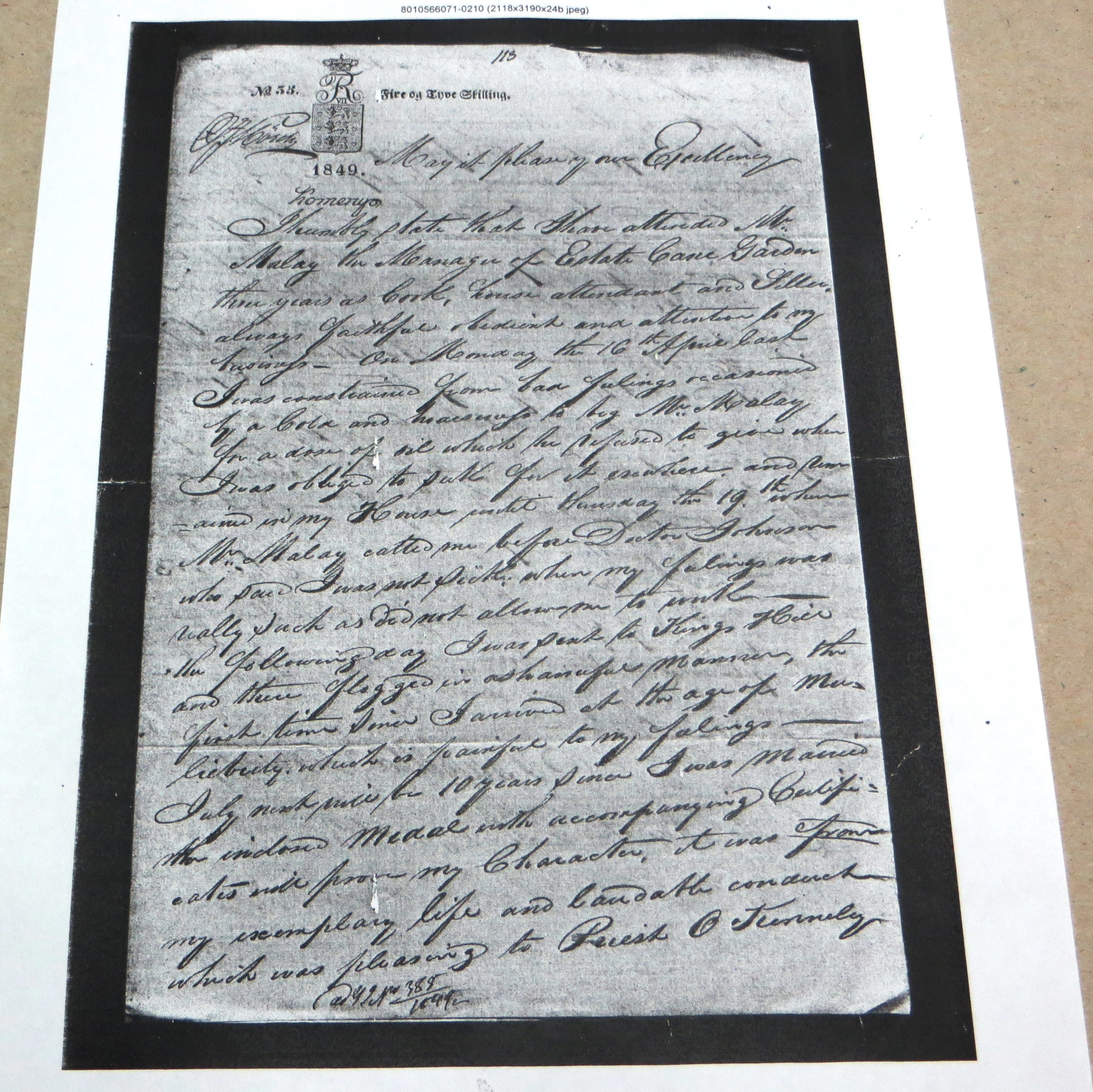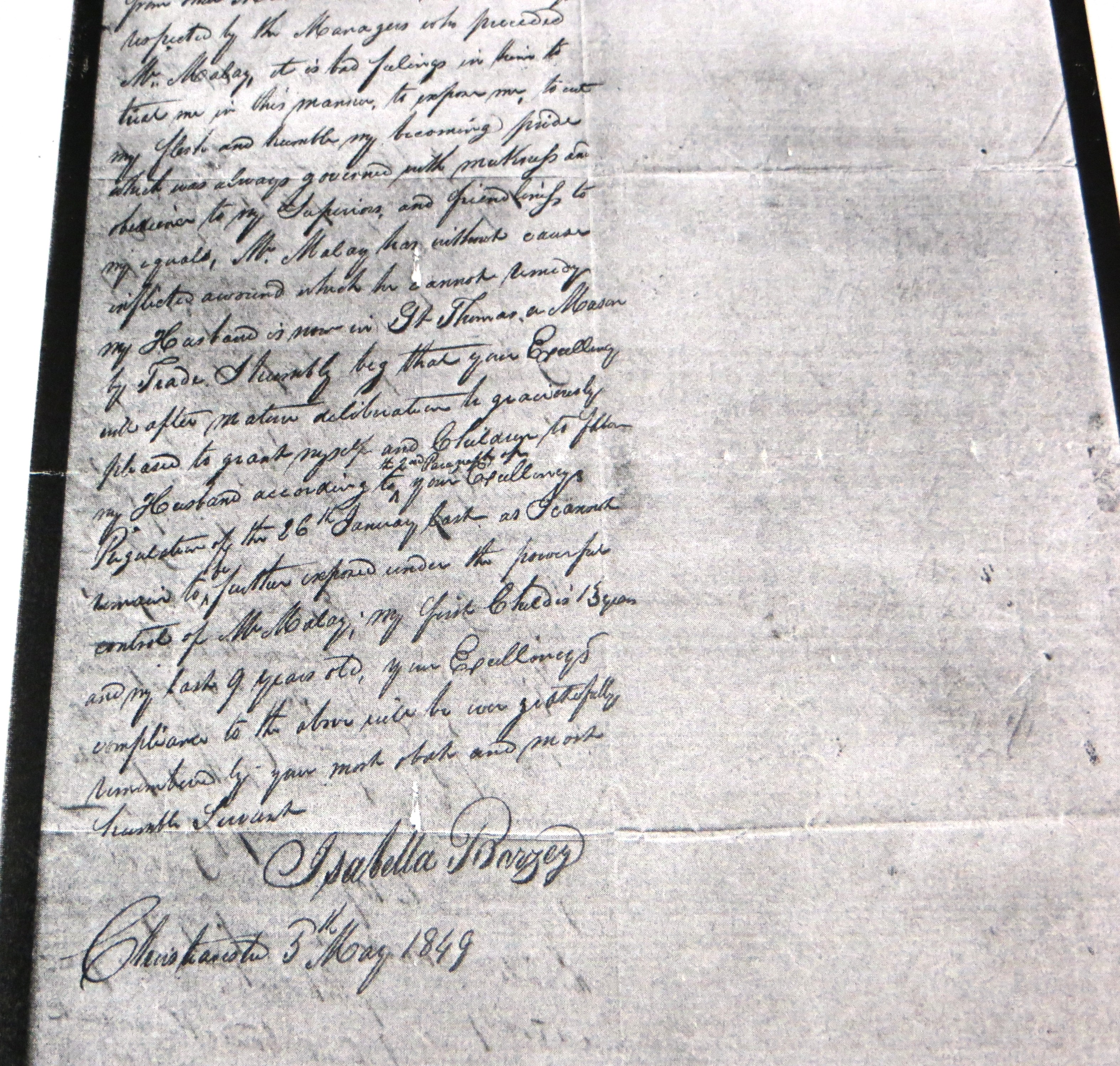 who honored me with this mark of distinction from other married women.  I was always respected from the managers who preceded Mr. Maloy, it is bad feelings in him to treat me in this manner, to expose me, to cut my flesh and humble my becoming pride which was always govern with markings of obedience to my superiors, and friendship to my equals.  Mr. Maloy has without cause inflicted a wound which he cannot remedy.  My husband is now in St. Thomas a Mason of trade.  I humbly beg that your Excellency will after mature deliberations be graciously pleased to grant myself and children to follow my husband according to the 2nd paragraph of your excellency Regulation of the 26th January last as I cannot remain to be further exposed under the powerful control of Mr. Maloy; my first child is 13 years old and my last 9 years old, your excellency’s compliance to the above will be ever gratefully remembered by your most humble servant.